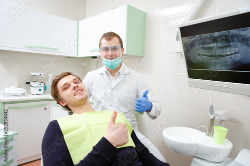 Cheerful Smiling Male Patient And Young Dentist During Check Up At Young Dentist